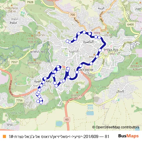 Click here to view the nearest 81 - 201/609-יפיע<->סאליזיאן/רואוס אל-ג'באל-נצרת-1# bus stop.