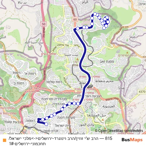 The first stop of the 815 bus route is הרב ש'י זווין/הרב וינוגרד and the last stop is מלכי ישראל/תחכמוני. 815 (הרב ש'י זווין/הרב וינוגרד-ירושלים<->מלכי ישראל/תחכמוני-ירושלים-1#) is operational during כל יום.