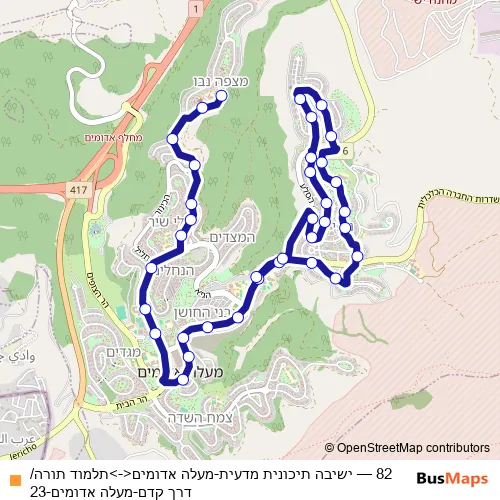 Bus 82 - ישיבה תיכונית מדעית-מעלה אדומים<->תלמוד תורה/דרך קדם-מעלה אדומים-23 in Jerusalem: Stops & Timetable