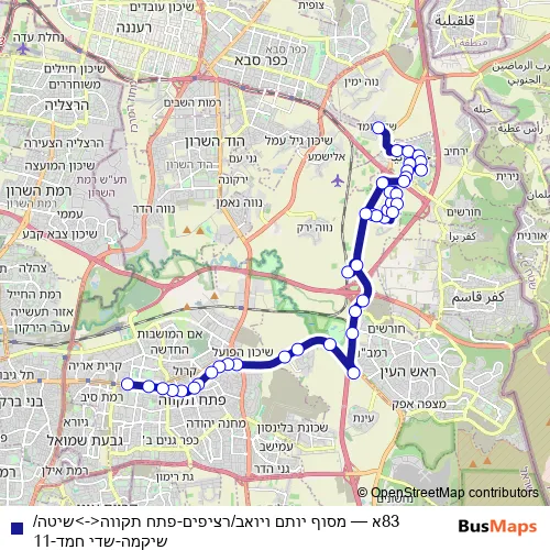 The first stop of the 83א bus route is שיטה/שיקמה and the last stop is ת. רק'ל בלינסון/קניון אבנת. 83א (מסוף יותם ויואב/רציפים-פתח תקווה<->שיטה/שיקמה-שדי חמד-11) is operational during כל יום.