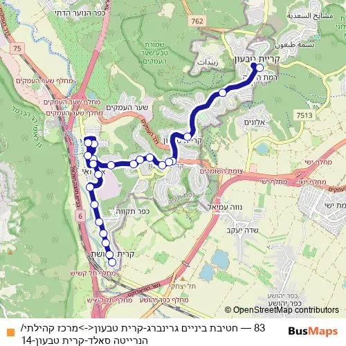 The first stop of the 83 bus route is חטיבת ביניים גרינברג and the last stop is מרכז קהילתי/הנרייטה סאלד. 83 (חטיבת ביניים גרינברג-קרית טבעון<->מרכז קהילתי/הנרייטה סאלד-קרית טבעון-14) is operational during כל יום.