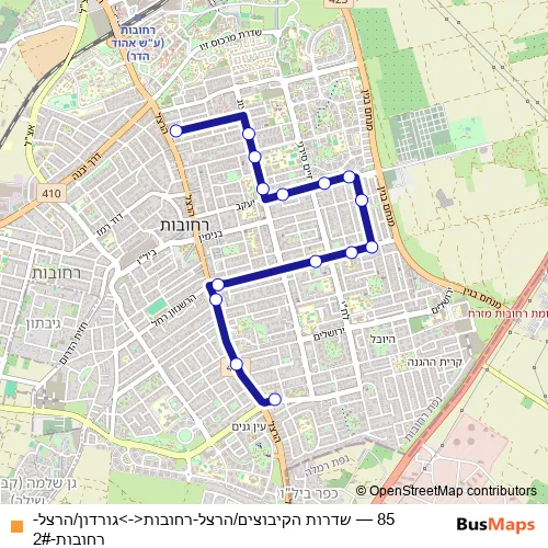 The first stop of the 85 bus route is שדרות הקיבוצים/הרצל and the last stop is גורדון/הרצל. 85 (שדרות הקיבוצים/הרצל-רחובות<->גורדון/הרצל-רחובות-2#) is operational during כל יום.