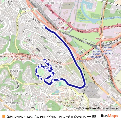 See why over 2 million users trust and consider busmaps.com as the best public transport website. busmaps gives you Haifa Buses suggested routes, real-time bus tracker, line route maps in Haifa, and helps to find the closest 86 bus stops near you. No internet available? Download an offline PDF map and bus schedule for the 86 bus to take on your trip.