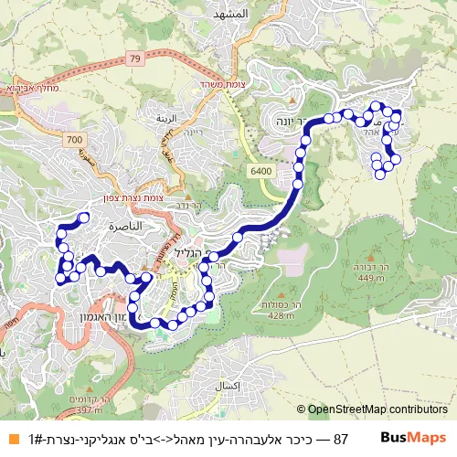 The first stop of the 87 bus route is כיכר אלעבהרה and the last stop is בי'ס אנגליקני. 87 (כיכר אלעבהרה-עין מאהל<->בי'ס אנגליקני-נצרת-1#) is operational during בימי חול.