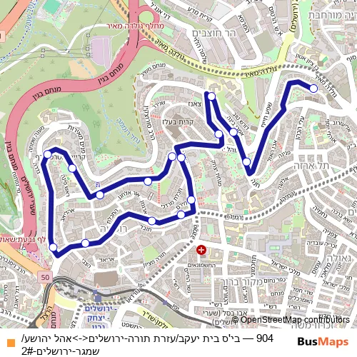 The first stop of the 904 bus route is בי'ס בית יעקב/עזרת תורה and the last stop is אהל יהושע/שמגר. 904 (בי'ס בית יעקב/עזרת תורה-ירושלים<->אהל יהושע/שמגר-ירושלים-2#) is operational during כל יום.