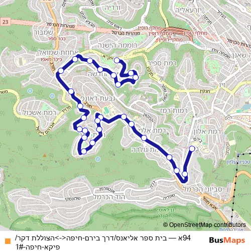 The first stop of the 94א bus route is בית ספר אליאנס/דרך בירם and the last stop is הצוללת דקר/פיקא. 94א (בית ספר אליאנס/דרך בירם-חיפה<->הצוללת דקר/פיקא-חיפה-1#) is operational during כל יום.