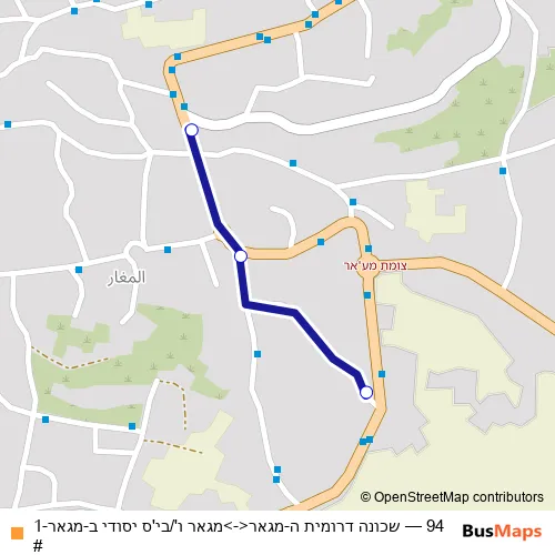 The first stop of the 94 bus route is שכונה דרומית ה and the last stop is מגאר ו'/בי'ס יסודי ב. 94 (שכונה דרומית ה-מגאר<->מגאר ו'/בי'ס יסודי ב-מגאר-1#) is operational during כל יום.