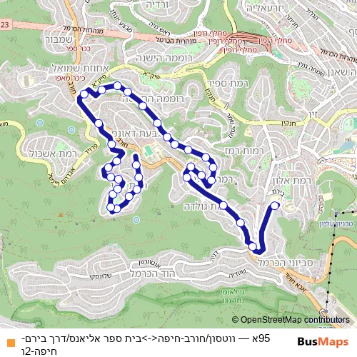 The first stop of the 95א bus route is ווטסון/חורב and the last stop is בית ספר אליאנס/דרך בירם. 95א (ווטסון/חורב-חיפה<->בית ספר אליאנס/דרך בירם-חיפה-2ו) is operational during כל יום.