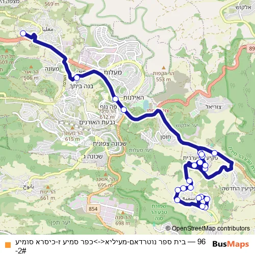 The first stop of the 96 bus route is בית ספר נוטרדאם and the last stop is כפר סמיע ז. 96 (בית ספר נוטרדאם-מעיליא<->כפר סמיע ז-כיסרא סומיע-2#) is operational during בימי חול.