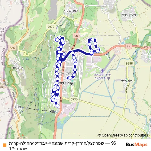 The first stop of the 96 bus route is שפרינצק/הירדן and the last stop is ברזילי/החולה. 96 (שפרינצק/הירדן-קרית שמונה<->ברזילי/החולה-קרית שמונה-1#) is operational during כל יום.
