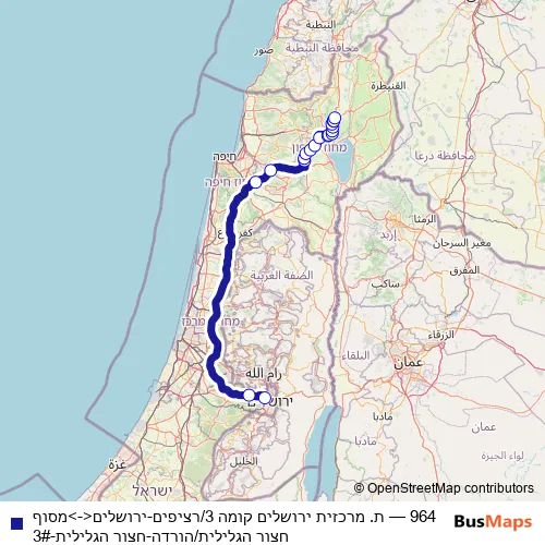 The first stop of the 964 bus route is ת. מרכזית ירושלים קומה 3/רציפים and the last stop is מסוף חצור הגלילית/הורדה. 964 (ת. מרכזית ירושלים קומה 3/רציפים-ירושלים<->מסוף חצור הגלילית/הורדה-חצור הגלילית-3#) is operational during כל יום.