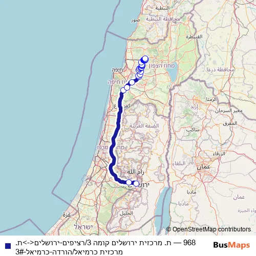The first stop of the 968 bus route is ת. מרכזית ירושלים קומה 3/רציפים and the last stop is ת. מרכזית כרמיאל/הורדה. 968 (ת. מרכזית ירושלים קומה 3/רציפים-ירושלים<->ת. מרכזית כרמיאל/הורדה-כרמיאל-3#) is operational during כל יום.