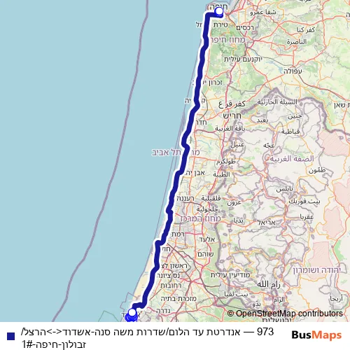 The first stop of the 973 bus route is אנדרטת עד הלום/שדרות משה סנה and the last stop is הרצל/זבולון. 973 (אנדרטת עד הלום/שדרות משה סנה-אשדוד<->הרצל/זבולון-חיפה-1#) is operational during בסופי שבוע.