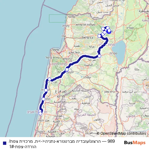 The first stop of the 989 bus route is הרצוג/עובדיה מברטנורא and the last stop is ת. מרכזית צפת/הורדה. 989 (הרצוג/עובדיה מברטנורא-נתניה<->ת. מרכזית צפת/הורדה-צפת-1#) is operational during כל יום.