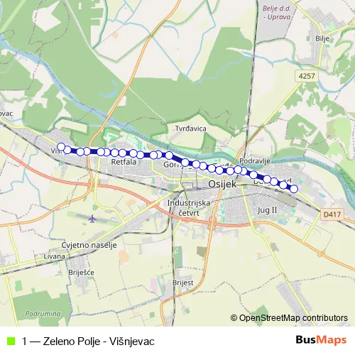 The first stop of the 1 bus route is Okretište Zeleno Polje and the last stop is Višnjevac-Okretište Ul.Bana J. Jelačića. 1 (Zeleno Polje - Višnjevac) is operational during svakodnevno.