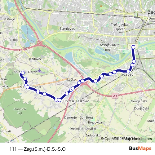 The first stop of the 111 bus route is Stupnički Obrež and the last stop is Savski most. 111 (Zag.(S.m.)-D.S.-S.O) is operational during svakodnevno.