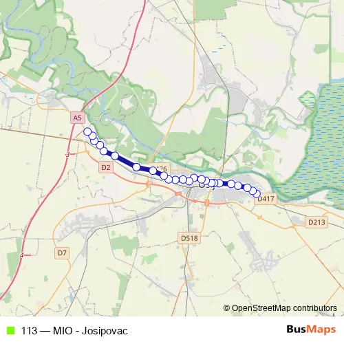 The first stop of the 113 bus route is Mio and the last stop is Josipovac/ Okretište Osječka Ul.. 113 (MIO - Josipovac) is operational during radnim danima.