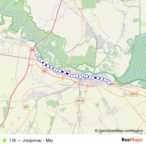 The first stop of the 116 bus route is Josipovac/ Okretište Osječka Ul. and the last stop is Mio. 116 (Josipovac - Mio) is operational during svakodnevno.