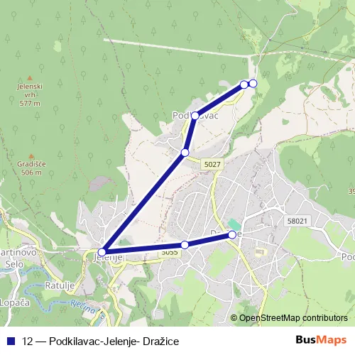 The first stop of the 12 bus route is Podkilavac okretište and the last stop is Dražice Centar B. 12 (Podkilavac-Jelenje- Dražice) is operational during svakodnevno.
