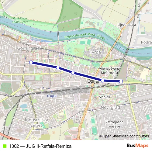 See why over 2 million users trust and consider busmaps.com as the best public transport website. busmaps gives you Osijek Buses suggested routes, real-time bus tracker, line route maps in Osijek, and helps to find the closest 1302 bus stops near you. No internet available? Download an offline PDF map and bus schedule for the 1302 bus to take on your trip.