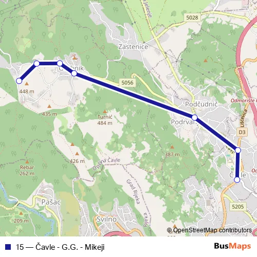 The first stop of the 15 bus route is Čavle - centar A and the last stop is Mikeji okretište. 15 (Čavle - G.G. - Mikeji) is operational during svakodnevno.