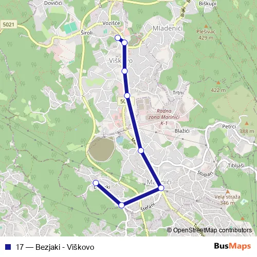 The first stop of the 17 bus route is Bezjaki and the last stop is Viškovo škola Sv.Matej. 17 (Bezjaki - Viškovo) is operational during radnim danima.