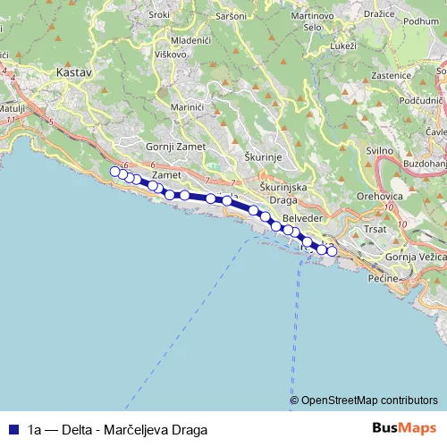 The first stop of the 1a bus route is Delta and the last stop is Marčeljeva Draga. 1a (Delta - Marčeljeva Draga) is operational during svakodnevno.