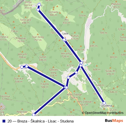 The first stop of the 20 bus route is Breza and the last stop is Studena centar. 20 (Breza - Škalnica - Lisac - Studena) is operational during radnim danima.