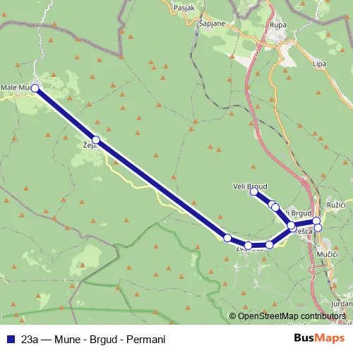 The first stop of the 23a bus route is Mune and the last stop is Permani 2 terminal. 23a (Mune - Brgud - Permani) is operational during svakodnevno.