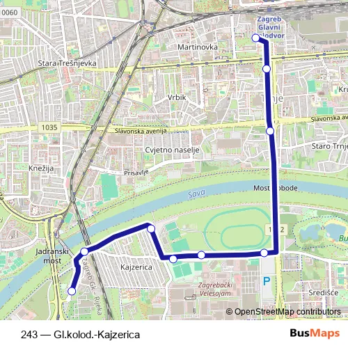 The first stop of the 243 bus route is Glavni kolodvor and the last stop is Remetinečka 15. 243 (Gl.kolod.-Kajzerica) is operational during svakodnevno.