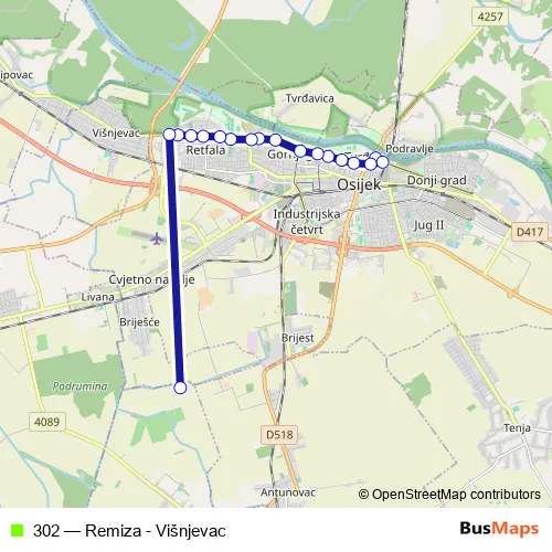 The first stop of the 302 bus route is Remiza and the last stop is Strossmayerova Okretište Višnjevac. 302 (Remiza - Višnjevac) is operational during svakodnevno.