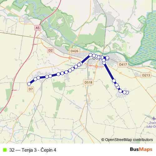 The first stop of the 32 bus route is Tenja / UL. FRA G. Martića and the last stop is Čepin - Okretište UL. Kralja Zvonimira. 32 (Tenja 3 - Čepin 4) is operational during radnim danima.