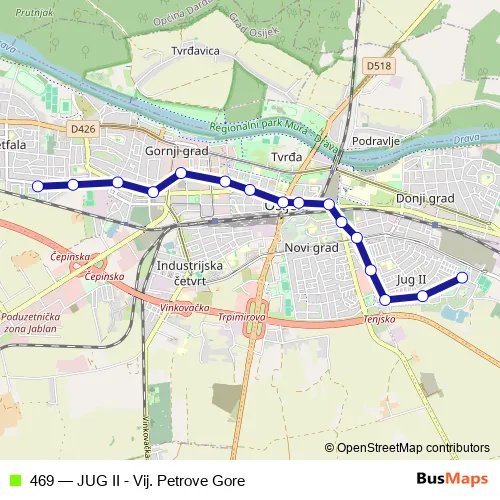 Bus 469 - JUG II - Vij. Petrove Gore in Osijek: Stops & Timetable