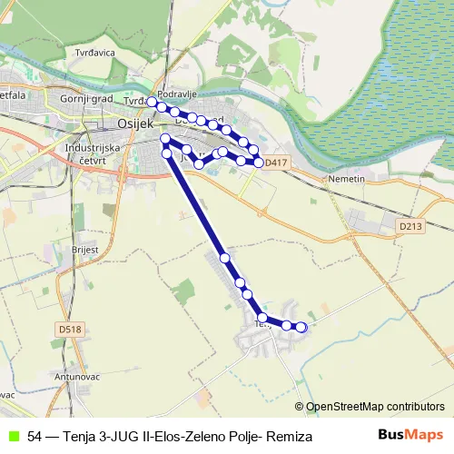 The first stop of the 54 bus route is Tenja – Okretište UL. V. Mačeka and the last stop is Remiza (Bus). 54 (Tenja 3-JUG II-Elos-Zeleno Polje- Remiza) is operational during svakodnevno.