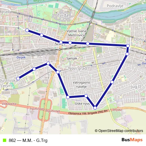 See why over 2 million users trust and consider busmaps.com as the best public transport website. busmaps gives you Osijek Buses suggested routes, real-time bus tracker, line route maps in Osijek, and helps to find the closest 862 bus stops near you. No internet available? Download an offline PDF map and bus schedule for the 862 bus to take on your trip.