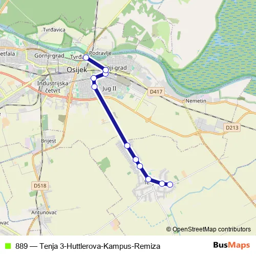 Bus 889 - Tenja 3-Huttlerova-Kampus-Remiza Schedule in Osijek