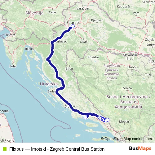 The first stop of the Flixbus bus route is Zagreb Central Bus Station and the last stop is Imotski Coach Station. Flixbus (Imotski - Zagreb Central Bus Station) is operational during svakodnevno.
