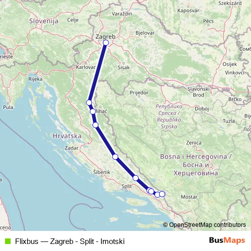 The first stop of the Flixbus bus route is Zagreb and the last stop is Imotski. Flixbus (Zagreb - Split - Imotski) is operational during svakodnevno.