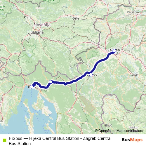 The first stop of the Flixbus bus route is Rijeka Central Bus Station and the last stop is Zagreb Central Bus Station. Flixbus (Rijeka Central Bus Station - Zagreb Central Bus Station) is operational during svakodnevno.