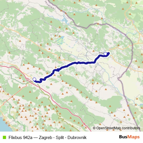The first stop of the Flixbus 942a bus route is Imotski Autobusni kolodvor and the last stop is Zagvozd. Flixbus 942a (Zagreb - Split - Dubrovnik) is operational during svakodnevno.