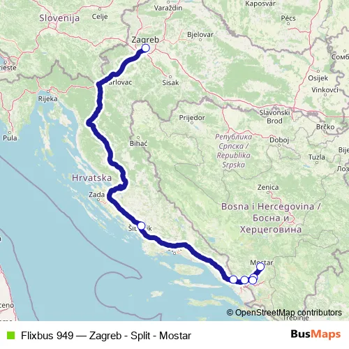 The first stop of the Flixbus 949 bus route is Mostar Zapadni kolodvor and the last stop is Zagreb (bus station). Flixbus 949 (Zagreb - Split - Mostar) is operational during svakodnevno.