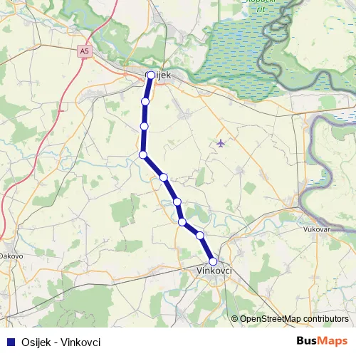 The first stop of the Osijek - Vinkovci rail route is Osijek and the last stop is