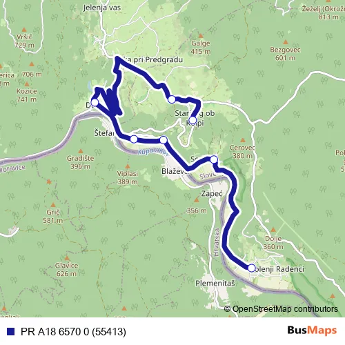 The first stop of the PR A18 6570 0 (55413) bus route is Radenci ob Kolpi and the last stop is St.trg ob Kolpi. PR A18 6570 0 (55413) (PR A18 6570 0 (55413)) is operational during radnim danima.
