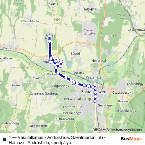 The first stop of the 1 bus route is Zalaegerszeg, vasútállomás and the last stop is Zalaegerszeg (Andráshida), sportpálya. 1 (Vasútállomás - Andráshida, Szentmártoni út (- Hatház) - Andráshida, sportpálya) is operational during minden nap.