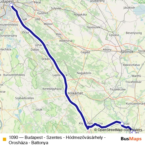 The first stop of the 1090 bus route is Budapest, Népliget autóbusz-pályaudvar and the last stop is Hódmezővásárhely, autóbusz-állomás. 1090 (Budapest - Szentes - Hódmezővásárhely - Orosháza - Battonya) is operational during minden nap.