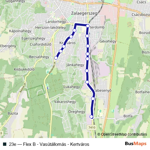 The first stop of the 23e bus route is Zalaegerszeg, Kertváros autóbusz-forduló and the last stop is Zalaegerszeg, botfai elágazás (Flex B). 23e (Flex B - Vasútállomás - Kertváros) is operational during hétköznapokon.