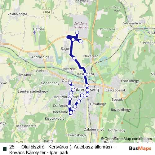 The first stop of the 25 bus route is Zalaegerszeg, Olai bisztró and the last stop is Zalaegerszeg, Michelberger út. 25 (Olai bisztró - Kertváros (- Autóbusz-állomás) - Kovács Károly tér - Ipari park) is operational during minden nap.