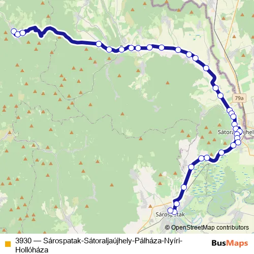 The first stop of the 3930 bus route is Telkibánya, községháza and the last stop is Sárospatak, vasútállomás. 3930 (Sárospatak-Sátoraljaújhely-Pálháza-Nyíri-Hollóháza) is operational during minden nap.