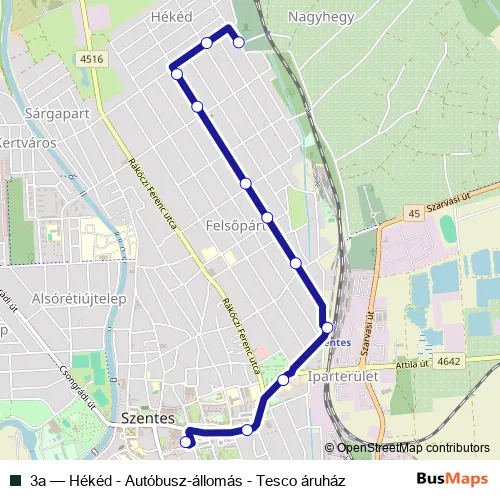 The first stop of the 3a bus route is Szentes, autóbusz-állomás and the last stop is Szentes, Hékéd. 3a (Hékéd - Autóbusz-állomás - Tesco áruház) is operational during minden nap.