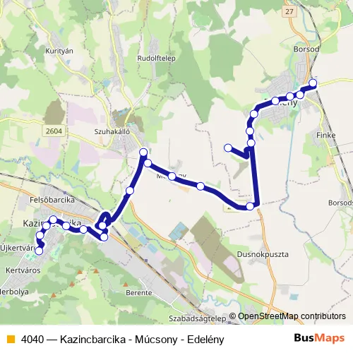 The first stop of the 4040 bus route is Edelény, vasútállomás and the last stop is Kazincbarcika, autóbusz-állomás. 4040 (Kazincbarcika - Múcsony - Edelény) is operational during minden nap.